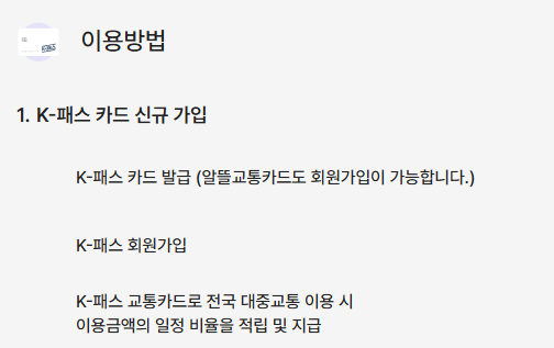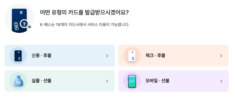 알뜰교통카드가 없는 분이라면 신규 가입을 통해 K패스 카드를 발급받아 바로 사용할 수 있습니다. - K패스 홈페이지에 접속하면 카드별 혜택을 안내해주고 발급가능합니다.